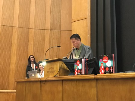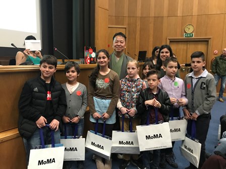 本年度のコンクールでは、草間彌生とその作品をテーマに、5歳から12歳の子供たちが学校別に草間氏の代表デザインである水玉を使ったショートフィルムを作成し、出品されました。受賞式では、ノミネート作品の上映がなされたのち、3部門9校への表彰が行われました。