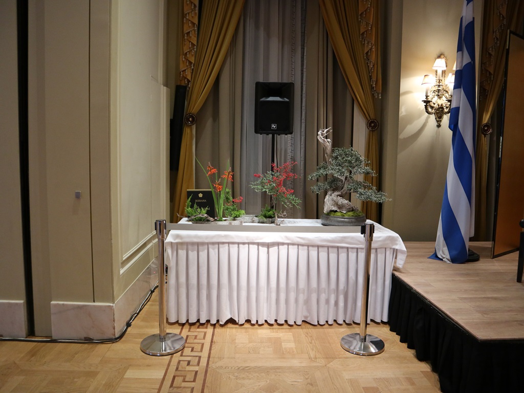 小原流いけばなギリシャ支部及びギリシャ盆栽クラブによる作品展示も行われ、会場に華が添えられました。
