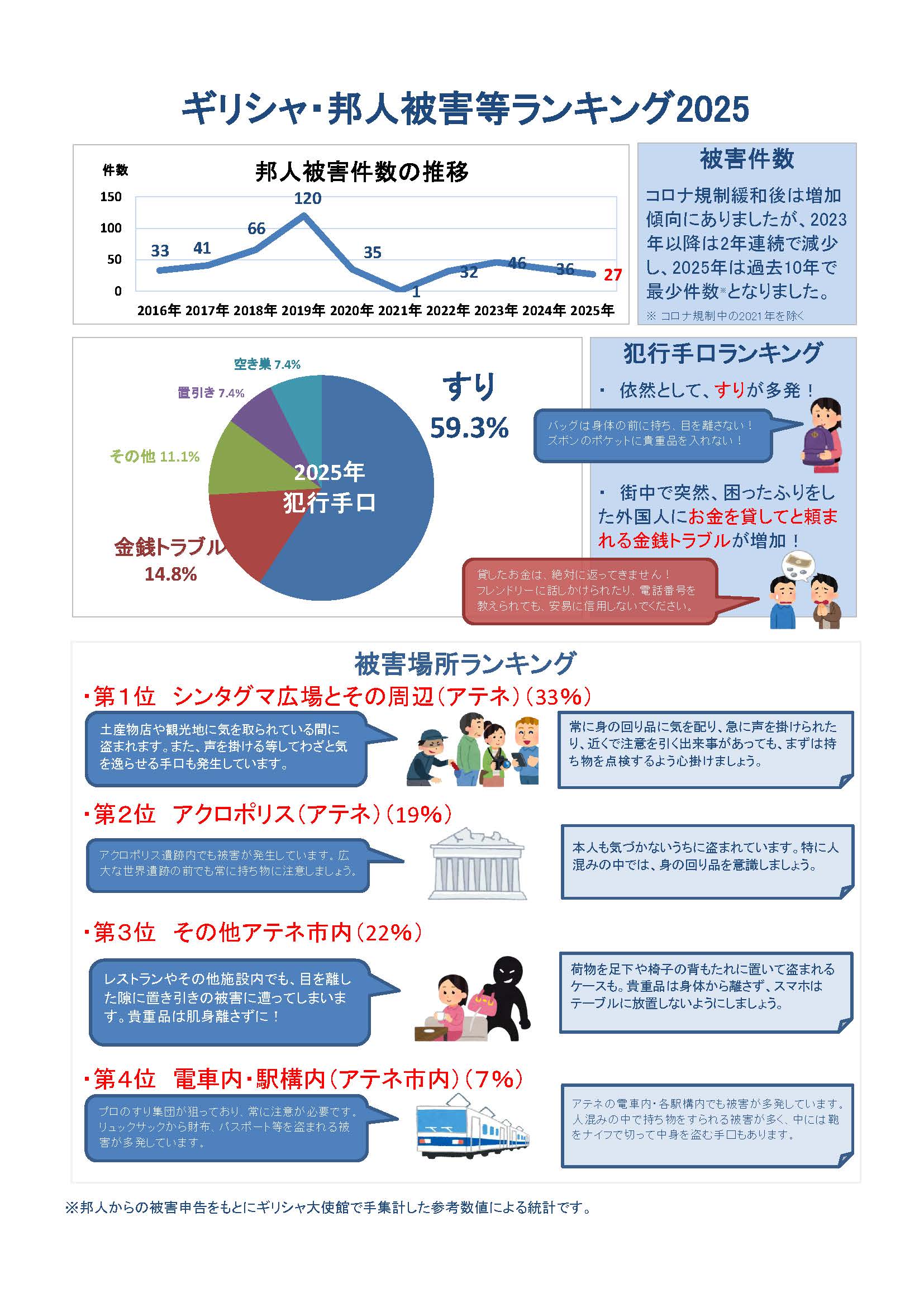 アテネや、サントリーニ島をはじめとするエーゲ海やイオニア海の島々、古代遺跡等、ギリシャで安全に過ごしていただくため、現地の最新治安情報をお伝えしています。ギリシャは比較的治安のよい国ですが、日本人のすり・置き引き被害が多く、ストライキやデモ、山火事も発生します。危険エリア(地域・地区)、犯罪、トラブル等の注意点を参考にしていただき、旅行、滞在、観光時の安全対策に役立てていただけますと幸いです。